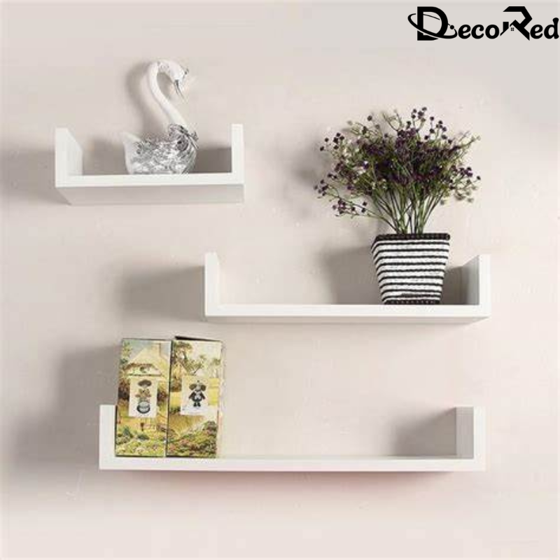 رفوف حائط عائمة على شكل حرف U مصنوعة من مادة MDF باللون الأبيض للتخزين.