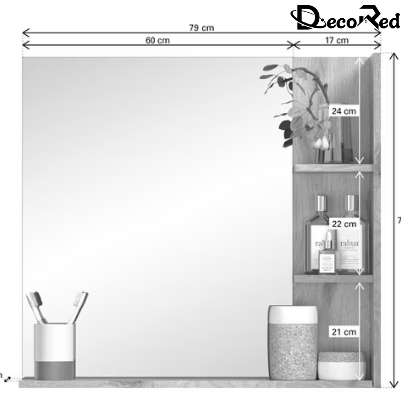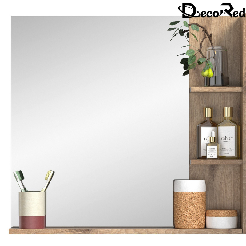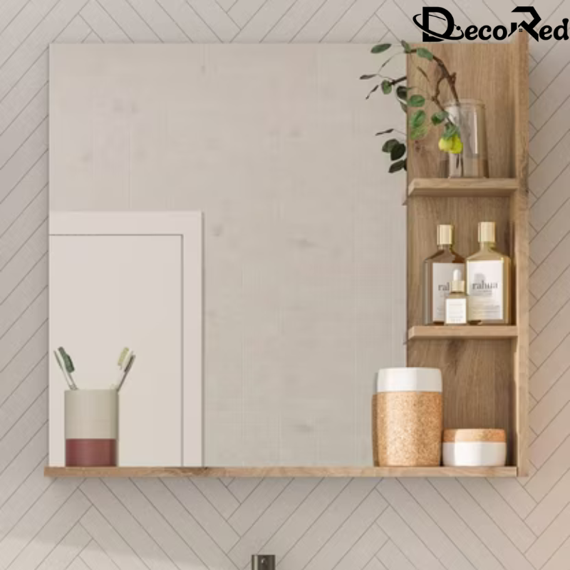 ✅ تصميم عملي يدمج بين المرآة ووحدة رفوف جانبية.